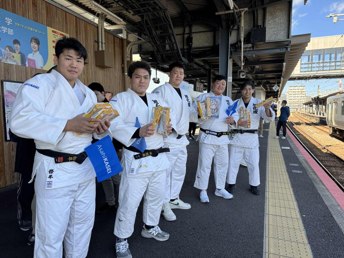 旭化成柔道部の選手たちが1月20日、延岡駅で6月に行われる「全日本実業柔道団体対抗大会」などのPRを行った。