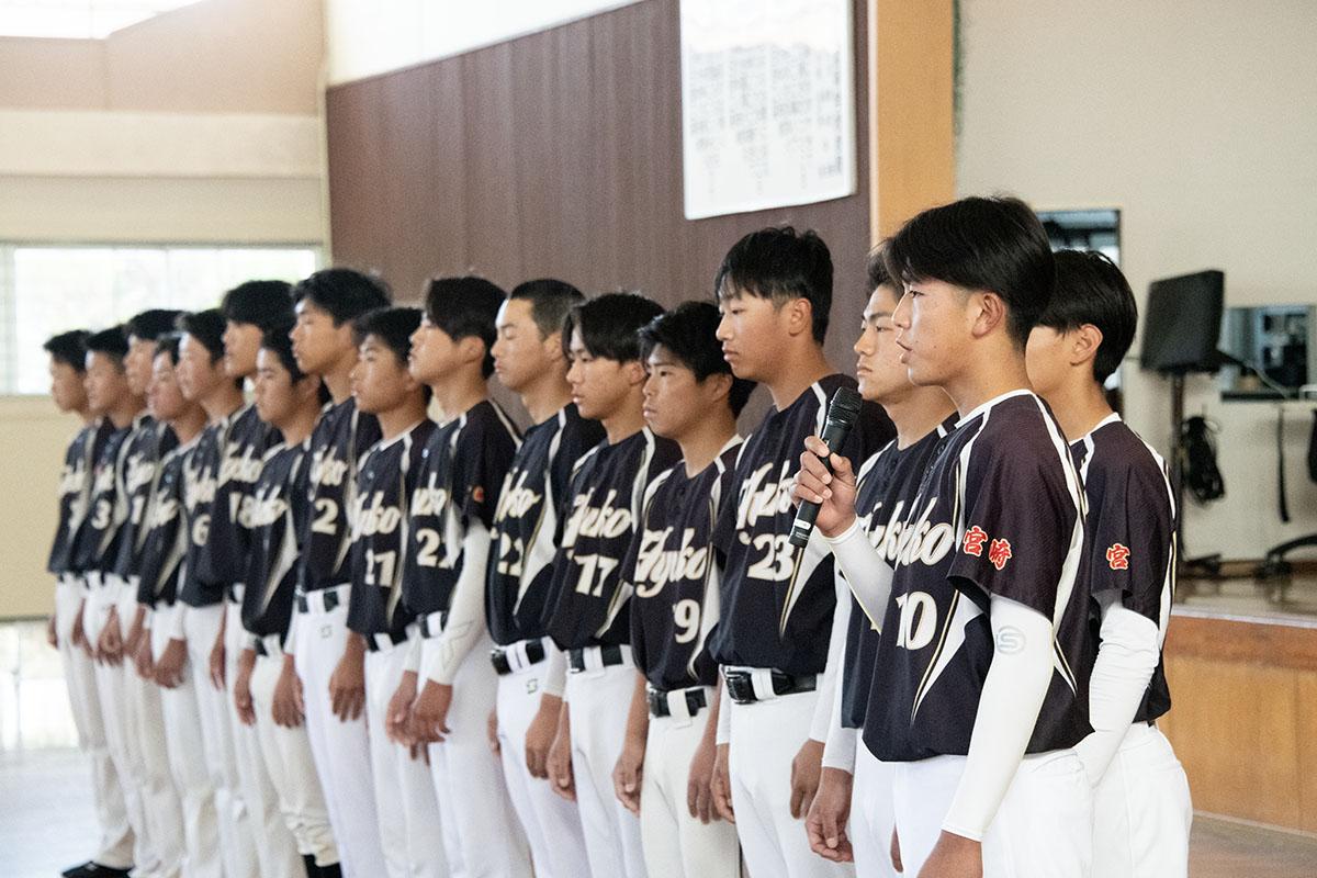 第44回全国高等学校男子ソフトボール選抜大会に出場する日向工業高校(日向市平岩)ソフトボール部の壮行式が3月11日、同校で開かれた。