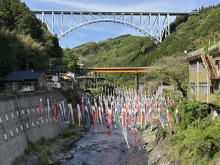 宮崎県北の山間部に位置する日之影町の中心を流れる日之影川に4月21日、約250匹のこいのぼりが掲げられた。
