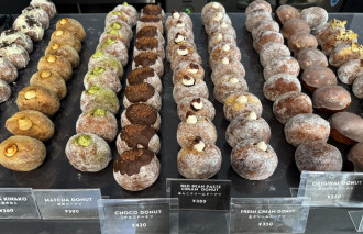 (左から)ブラックキャラメルラテ、チョコドーナツ、お芋ドーナツ