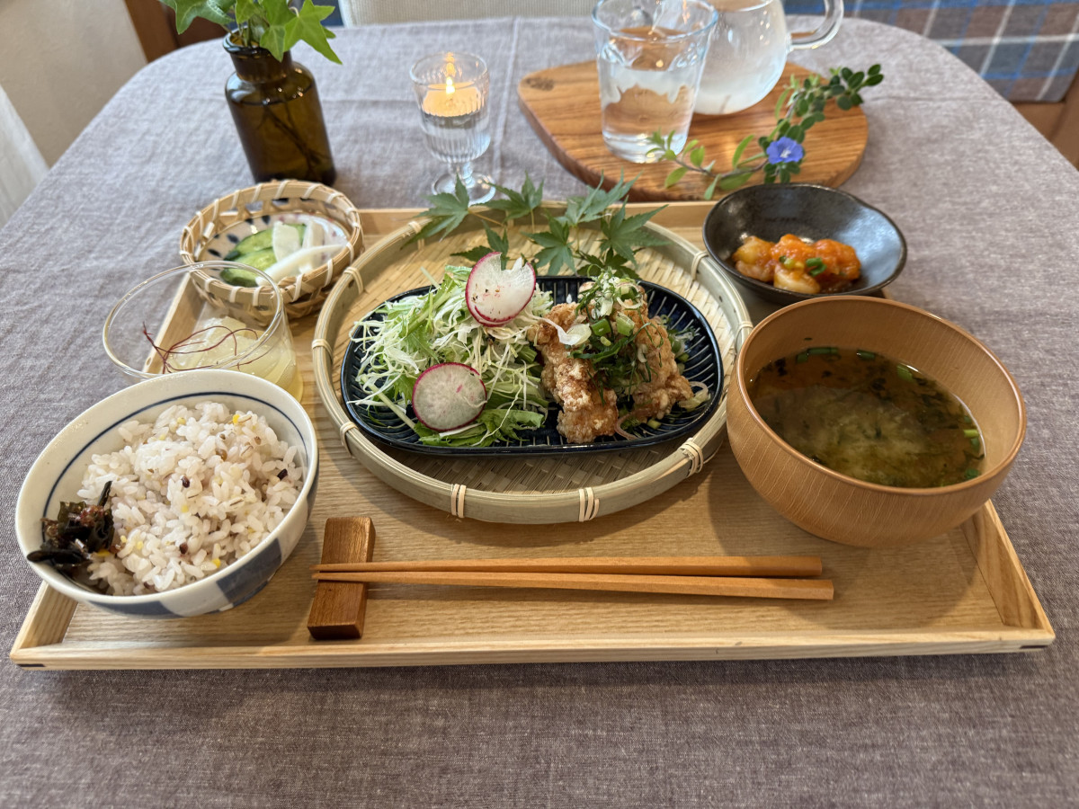 鶏の香味おろしがけ、エビのチリソース、トウガンの煮物、十六穀米、みそ汁の「寧定食」