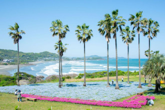 日向市幸脇の国道10号沿いにある県有地「金ヶ浜ビュー園地」で現在、ネモフィラが見頃を迎えている。