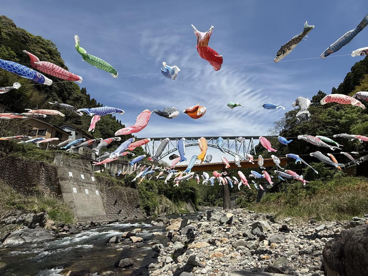 宮崎県北の山間部に位置する日之影町の中心を流れる日之影川に4月21日、約250匹のこいのぼりが掲げられた。