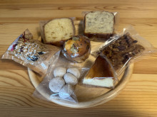 (手前から時計回りに)スノーボール、グラノーラ、キャラメルりんごのパウンドケーキ、バナナパウンドケーキ、キャラメルナッツバー、くまのチーズタルト、おいものマフィン