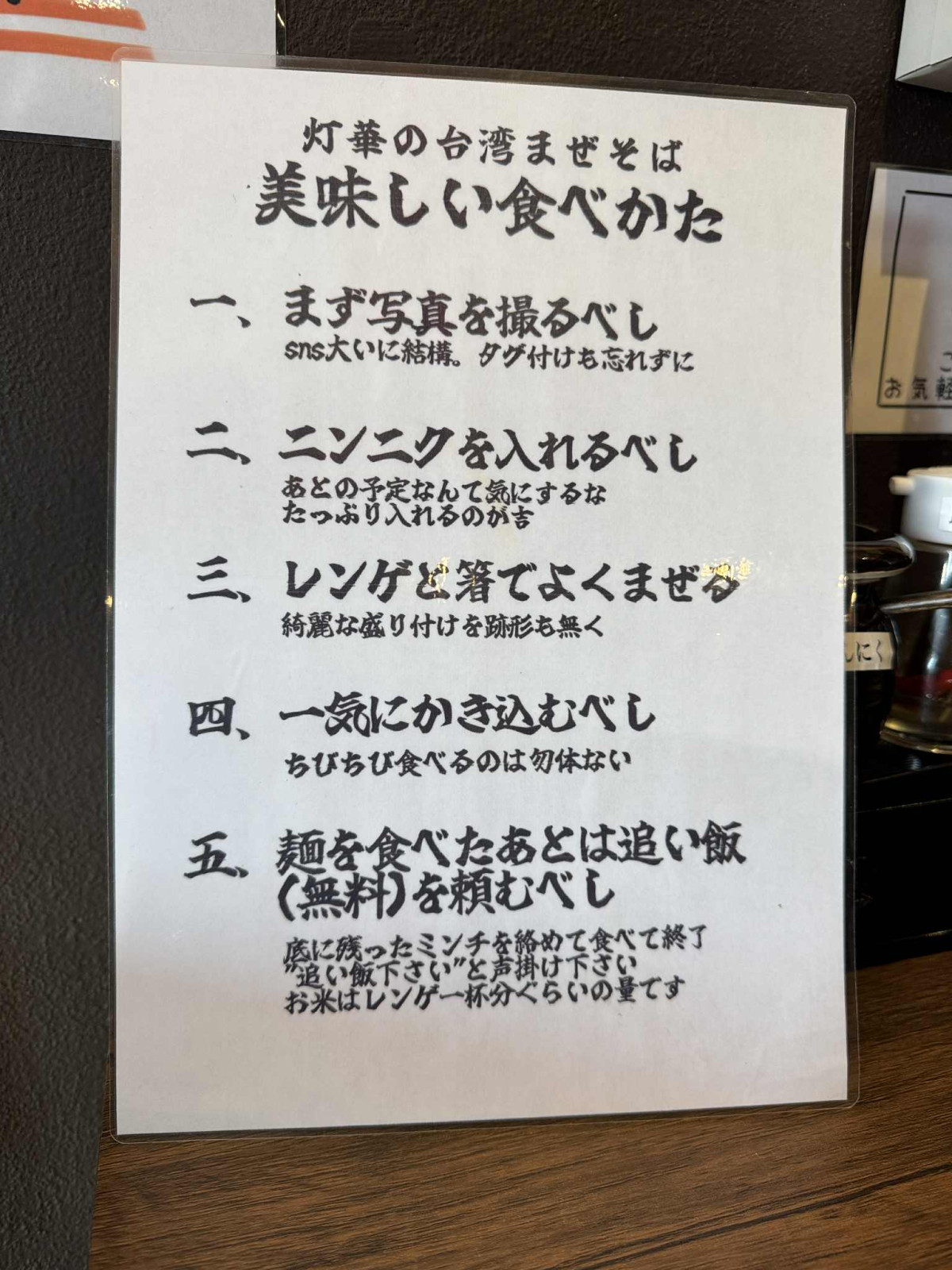 「まず写真を撮るべし」と書かれた台湾まぜそばのおいしい食べ方