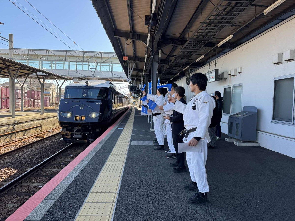 旭化成柔道部の選手たちが1月20日、延岡駅で6月に行われる「全日本実業柔道団体対抗大会」などのPRを行った。