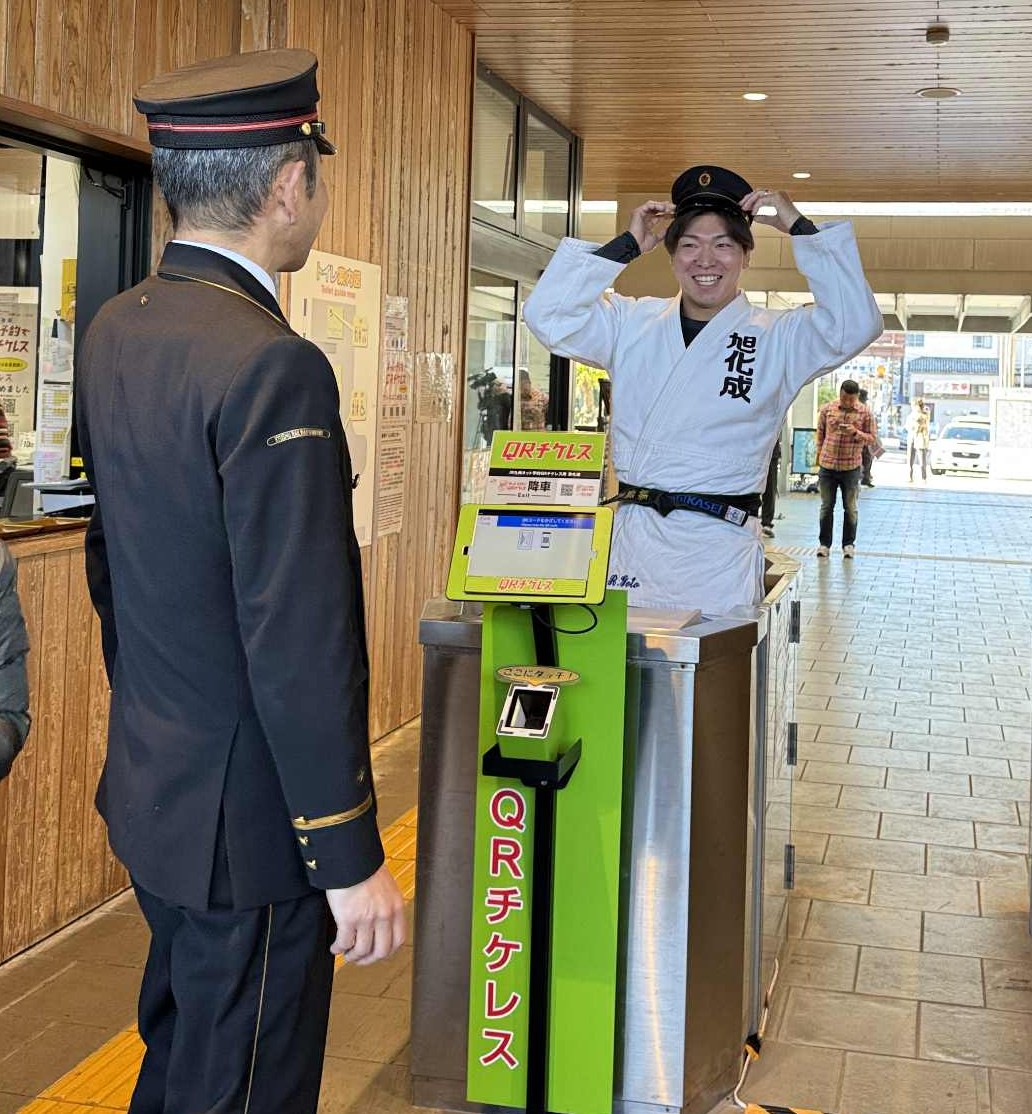 駅員の帽子を借りて笑顔を見せる後藤龍真選手