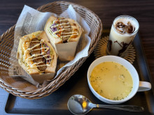 メンチカツとエッグの具材のサンドイッチ、カフェモカ、コーンスープ